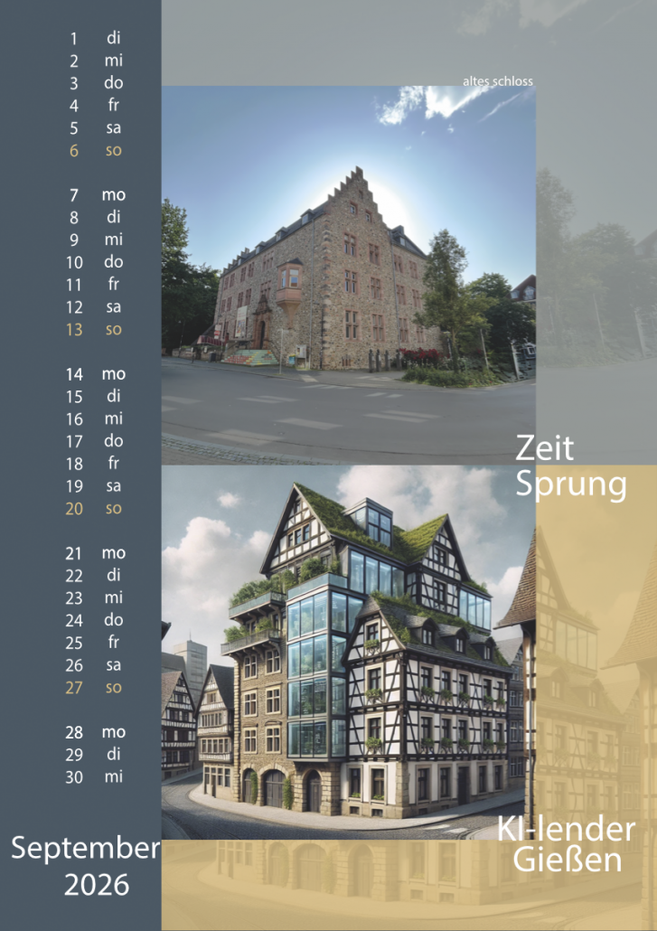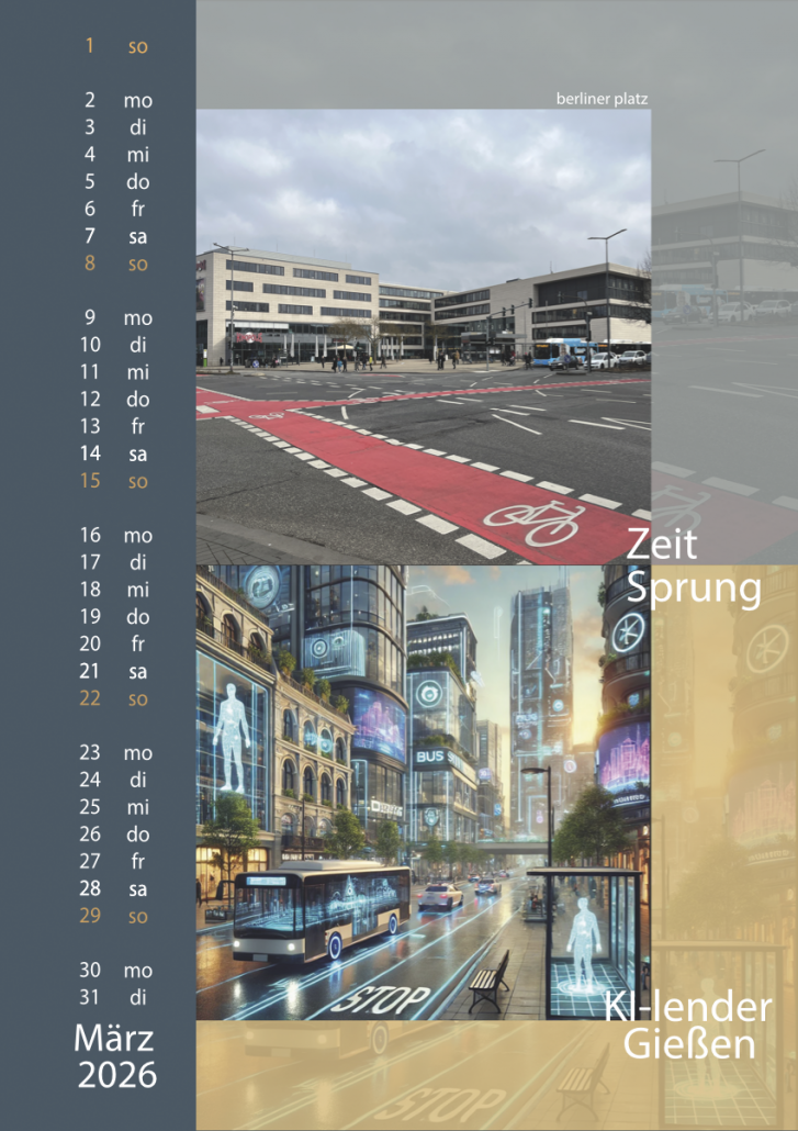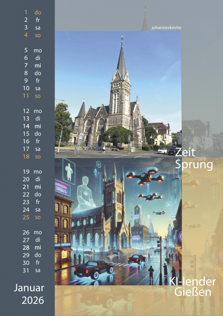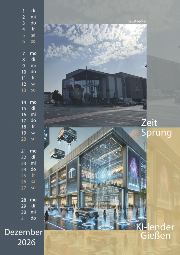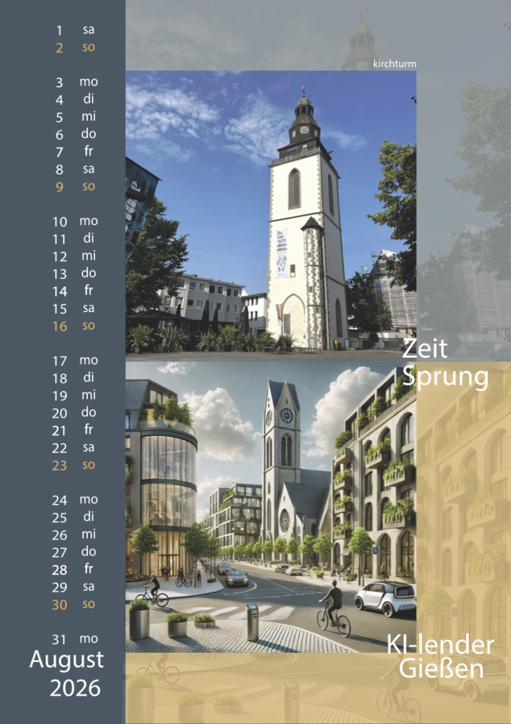 Für den neuen Kalender haben sich die Schülerinnen und Schüler der ehemaligen Klasse 9 (Schuljahr 2024/2025) unter der Leitung von Frau Bender und Frau Thiel für einen Zeitsprung in das Gießen der Zukunft entschieden. Sie haben dafür in Gießen wichtige Gebäude und Monumente fotografiert und diese mithilfe von KI umgestalten lassen. Dadurch ist eine interessante Gegenüberstellung entstanden. Ob es wirklich einmal so aussehen wird?! Wir sind gespannt.