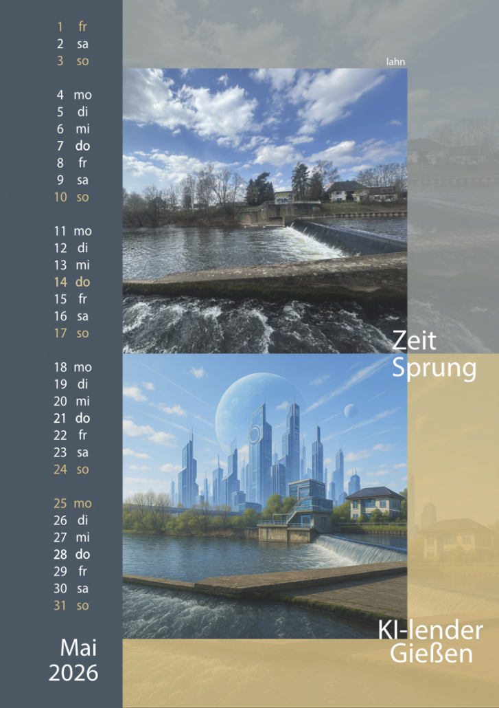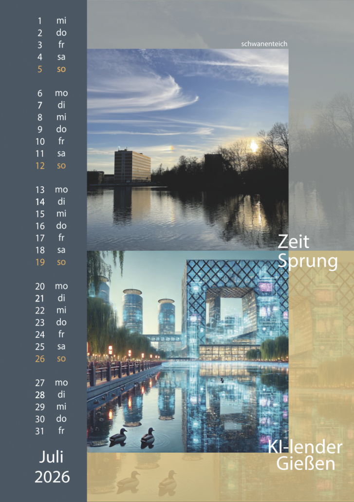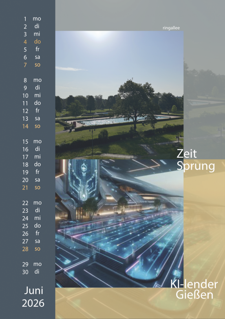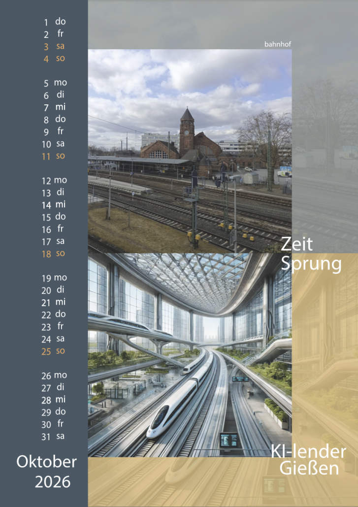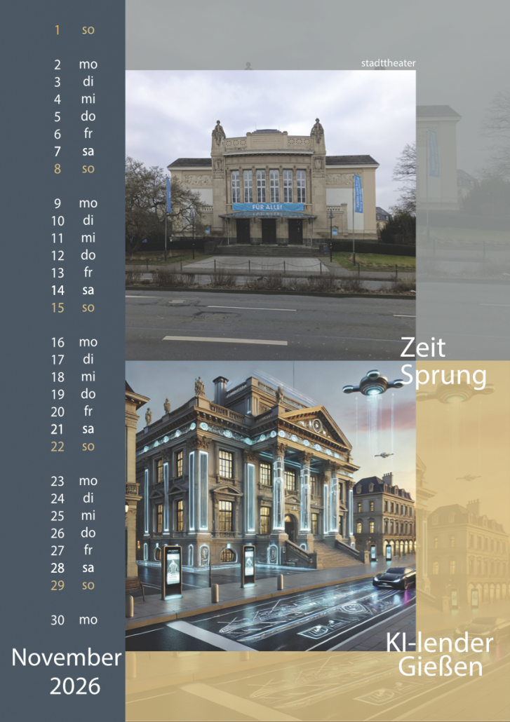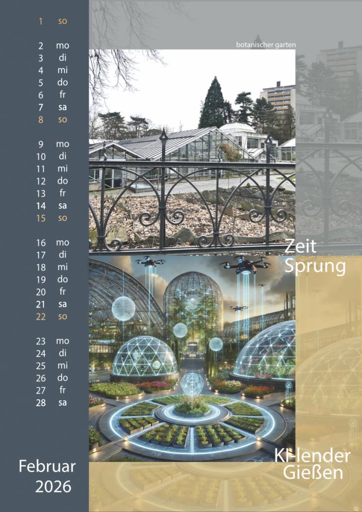 Für den neuen Kalender haben sich die Schülerinnen und Schüler der ehemaligen Klasse 9 (Schuljahr 2024/2025) unter der Leitung von Frau Bender und Frau Thiel für einen Zeitsprung in das Gießen der Zukunft entschieden. Sie haben dafür in Gießen wichtige Gebäude und Monumente fotografiert und diese mithilfe von KI umgestalten lassen. Dadurch ist eine interessante Gegenüberstellung entstanden. Ob es wirklich einmal so aussehen wird?! Wir sind gespannt.